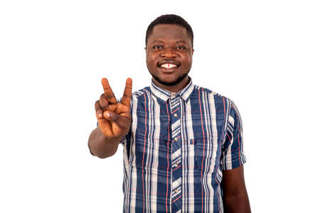 portrait of a handsome young man showing the victory sign with two fingers while smiling at the camera.