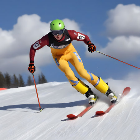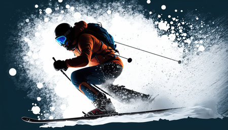 A skilled skier navigates a snowy slope, showcasing agility and speed against a colorful watercolor backdrop. The activity captures the thrill of winter sports in action.