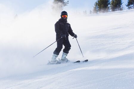 Bulgaria. Bansko. 10 February 2020. Skier riding down the huge snowfield splashing powder snow.