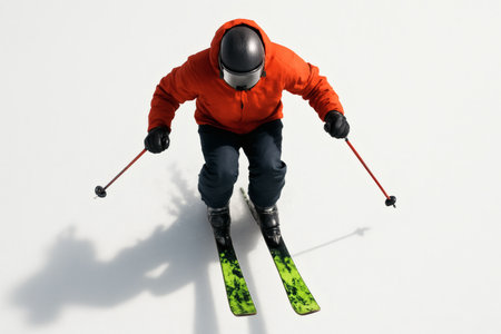 Professional skier in a vibrant red jacket carving through fresh snow on a sunlit slope, embodying the thrill of winter sports