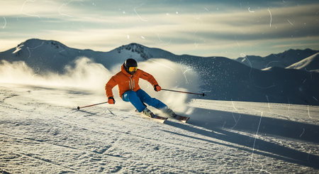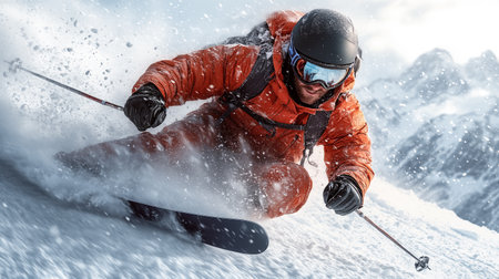 Dynamic skiing action man in bright orange gear descends majestic mountain slopes