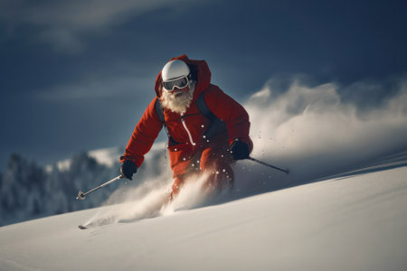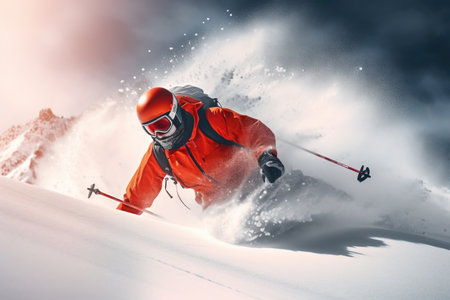 Skier in red jacket moves at mountain slope on sky background, man skiing downhill with splash of snow in winter. Concept of sport, powder, extreme, speed, spray, jumping, resort. Generative AI