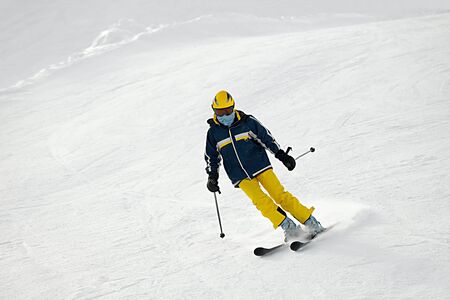 Skiing with face mask. winter vacation in pandemia. Portrait of caucasian young man with face mask. Winter is coming in new reality.