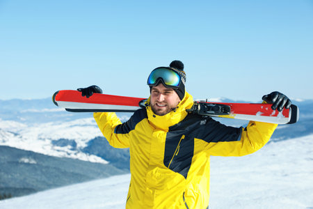 Young man skiing downhill in the mountains. Winter sports and healthy lifestyle.
