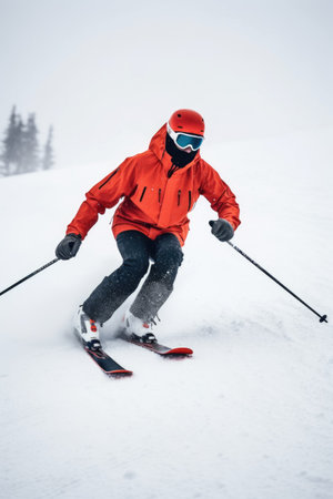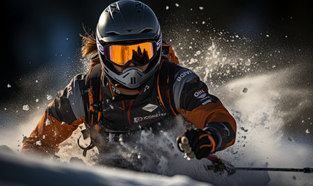 A skier slides down a snowy slope. The concept of downhill skiing training. The skier is wearing a protective helmet, mask and backpack. The image is characterized by dynamism and energy. The athlete leaves a trail of snowflakes behind him