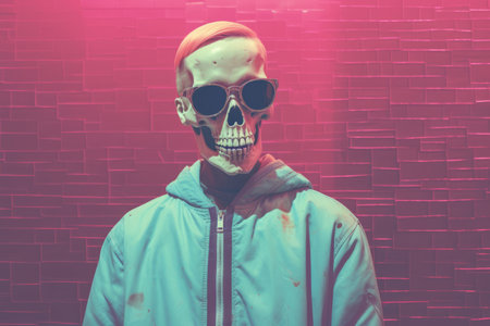 a man with a skull mask and sunglasses standing in front of a pink wall