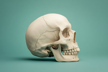 A realistic human skull displayed in profile against a teal background. The intricate details of the skull are highlighted, showcasing its anatomical features.ai generated.