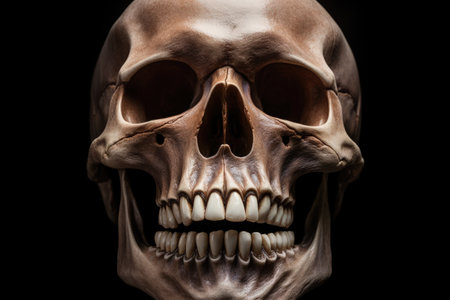 A human skull is prominently displayed against a black backdrop. The detailed view highlights the intricate structure and dental features, emphasizing its anatomical significance.