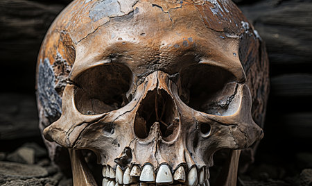 A solitary human skull isolated against a dark backdrop, highlighting the stark reality of mortality in a dramatic representation.. AI Generation