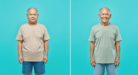 Senior men in casual attire against turquoise background for lifestyle and diversity concepts