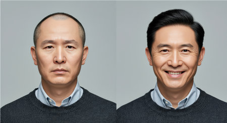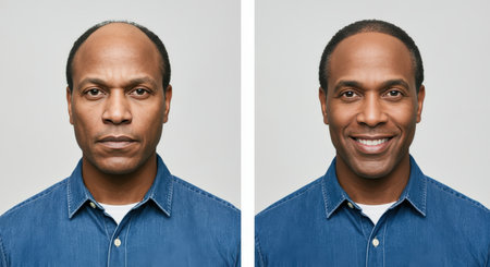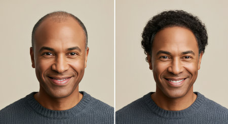 Transformation of mature african male smiling before and after hair growth in casual grey sweater