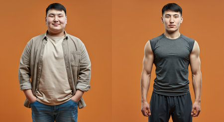 Transformation journey of asian male from casual to fitness enthusiast on orange background