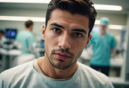 A young man with a focused expression is seated in a medical environment, possibly undergoing an assessment.