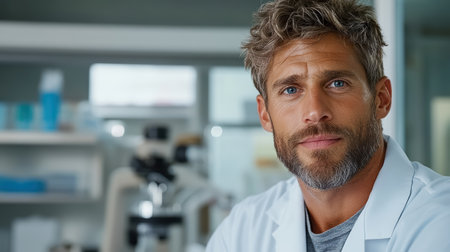 A confident man in lab coat smiles in research facility, showcasing expertise