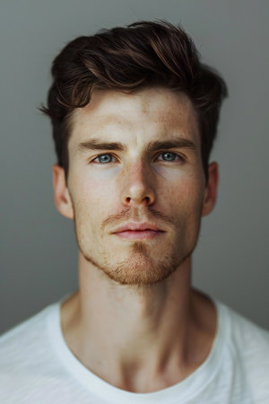Detailed Portrait of a Calm Man with Freckles and Flawless Complexion, Serene Expression in Studio