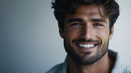 Man with a beard and a smile on his face. He is wearing a white shirt. Concept of happiness and positivity