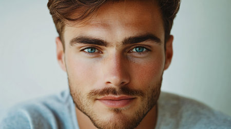 A young man from Russia gazes directly at the viewer with striking blue eyes. Tousled hair and relaxed expression. Introspection and tranquility. Portrait of a handsome man of 30 years. Generative AI.