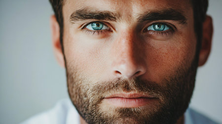 Man with a beard and blue eyes. He has a serious look on his face. The man is wearing a white shirt