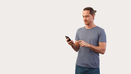 Using a smartphone by a young man on a blank background. Phone in hand while using the Internet, messenger, shopping, communication. Technology, applications, business concept.
