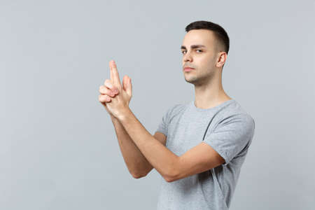 Portrait of confident young man in casual clothes looking camera, holding hands like gun isolated on grey wall background in studio. People sincere emotions, lifestyle concept. Mock up copy space