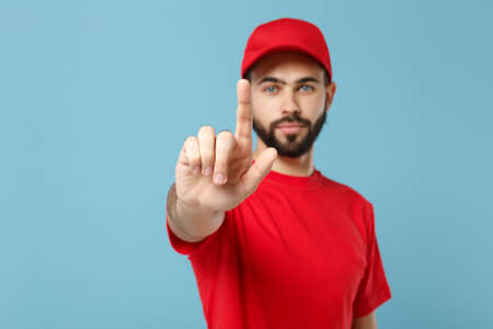 Delivery man in red uniform workwear isolated on blue wall background, studio portrait. Professional male employee in cap t-shirt print working as courier dealer. Service concept. Mock up copy space.