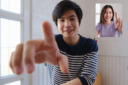 Young man video call with girl friends by application on laptop computer. Quarantine for 14 days, COVID-19, Social distancing concept.