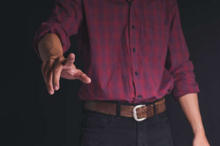 The man shows the gesture of pointing touching on the virtual screen. Investment ideas, business concepts, technology concepts.