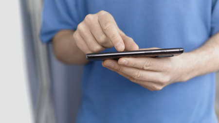 Closeup hands of a man using smartphone. He is typing message on mobile phone.
