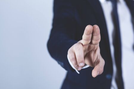 Close up of businessman touching invisible screen against grey background. business, professionalism and technology concept