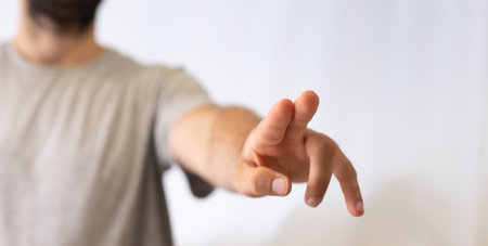 portrait man casual wear gray t-shirt fun hand gesture cropped view