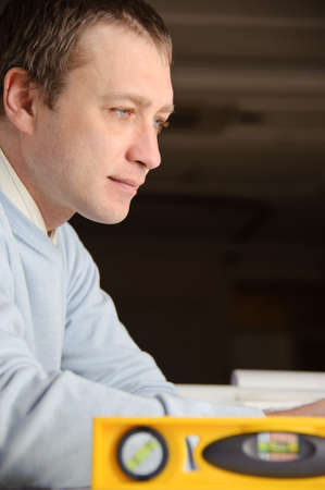 Portrait of engineer or architect in blue pullover is working on construction plans