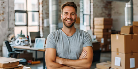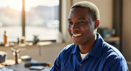 A smiling African male electronic factory worker standing in factory. Generative AI AIG19.