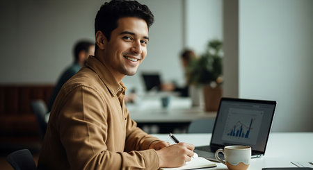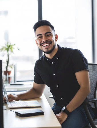 smiling Indian man with laptop at work in office, in the style of photorealistic portraits