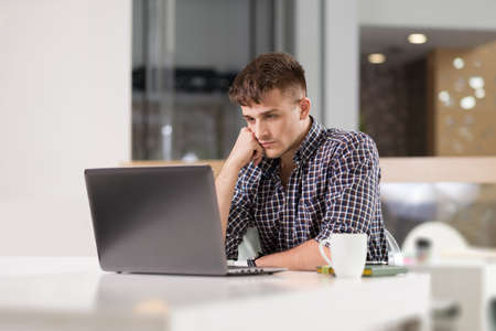Portrait of a young man sitting at a table in the office and working on a computer. Co-working, business. Business and entrepreneurship concept