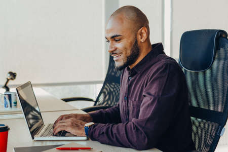 Young handsome black man concentrated focused to his laptop and working in serious mood in a modern office, copy space.