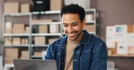 Smile, man and laptop at startup ecommerce to confirm order, quality assurance and inventory. Male person, pc and online checklist for supply chain, delivery price and information with catalog update