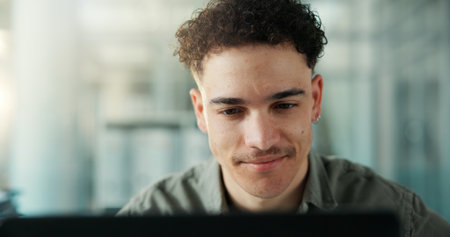 Media agency, computer and man in office, reading and pride with website blog. Person, employee and journalist in workplace, pc and research for news report, submission and email for publication