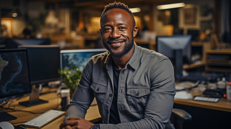 Portrait of young African-American man in casual clothes smiling and looking at camera in office