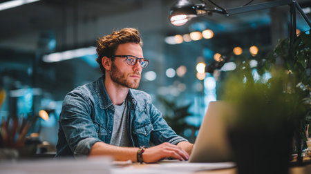 A man wearing glasses is sitting in front of a laptop computer. He is focused on the screen, possibly working or studying. Concept of concentration and productivity