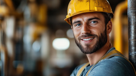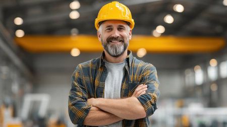 A cheerful man wearing a yellow hard hat and a plaid shirt stands confidently in an industrial setting, reflecting professionalism and dedication in his work environment.