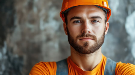 A young construction worker stands proudly with his arms crossed wearing an orange hard hat and matching shirt. His facial expression conveys confidence and focus while the textured wall behind him adds depth to the setting