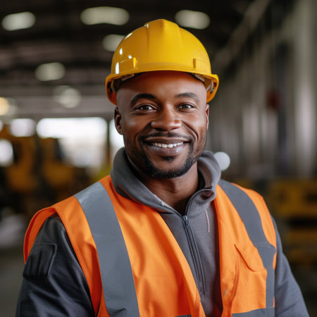 Portrait of Black People Male Engineer in Safety Vest and Hardhat. Professional Black People Man Working in the Modern Manufacturing Factory. Generative Ai