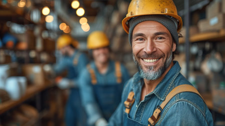 A cheerful industrial worker wearing a hard hat and gloves, smiling while working in a factory. Suitable for themes of labor, safety, and blue-collar jobs.