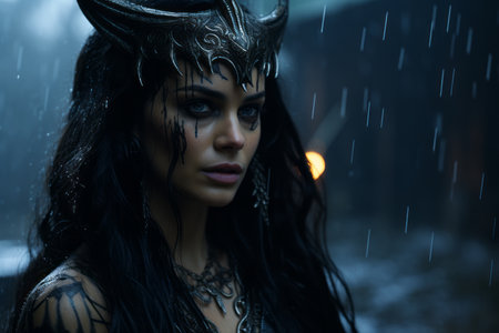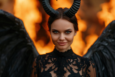 beautiful woman dressed as a fairy witch in raincoat and with horns for Halloween