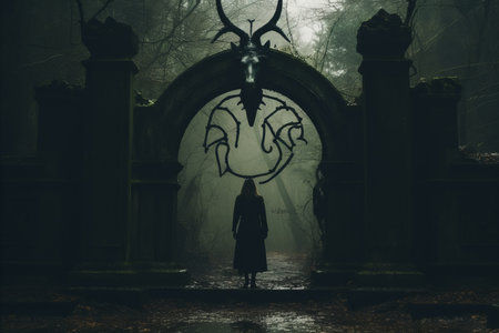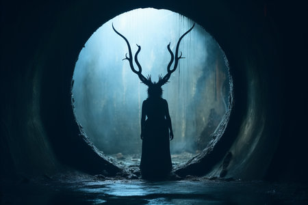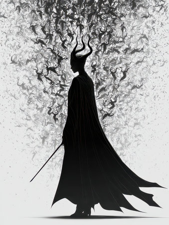A striking silhouette of a mysterious figure shrouded in a flowing cloak, complete with horns. The background features swirling dark elements, enhancing the magical and enigmatic feel of the artwork.