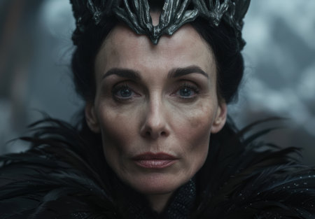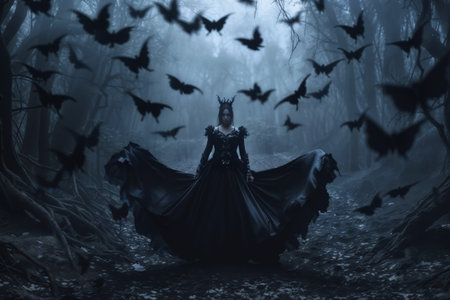 Majestic queen stands amongst fluttering crows in a foggy, enchanted forest
