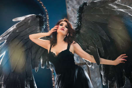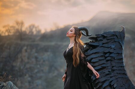 Fantasy dark magician in a black dress with huge wings and horns. Gothic model Transformation of mythical goddess Gamayun syrin. Fabolous mountains and cliffs. image outfit for Halloween party