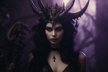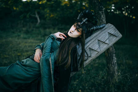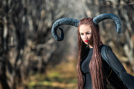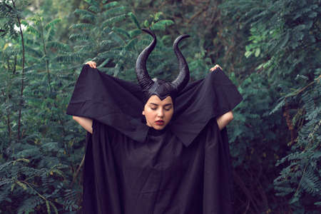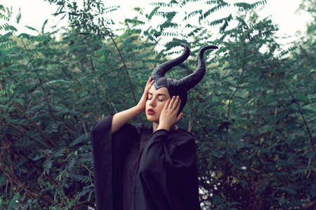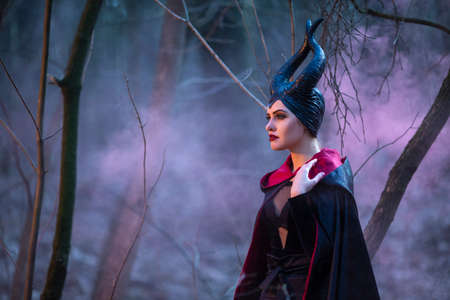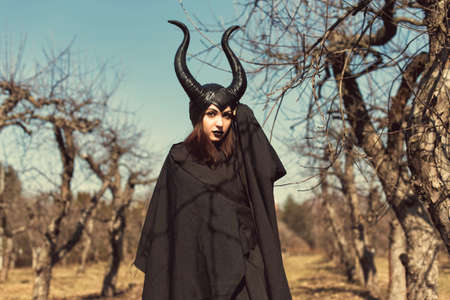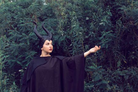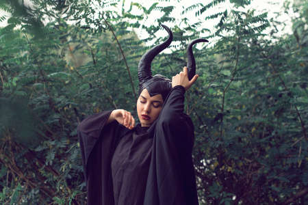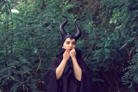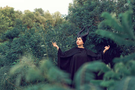 An incredibly beautiful witch in a black cloak with horns Maleficent in the forest. Halloween concept