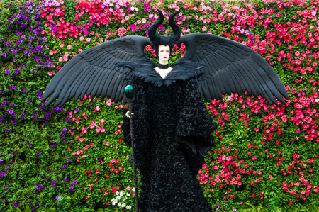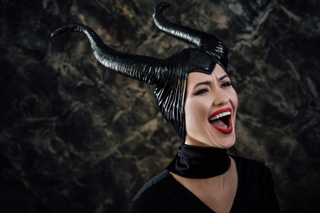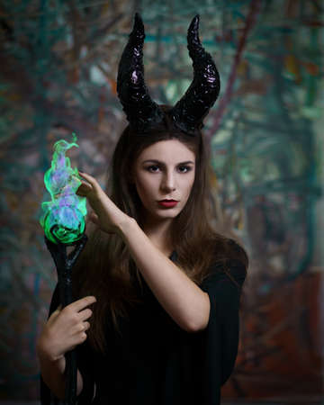 Maleficent demonic. young pretty dressed as a fairy with horns and magic ball