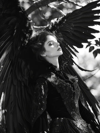 a black bird perches in a shopping mall, captured in the style of mythical portraiture. this dark fantasy creature is adorned with a detailed costume, creating an intriguing visual. the photograph, taken with a tokina at-x 11-16mm f/2.8 pro dx ii lens, showcases the artistic vision of meredith marsone. the image evokes a lovecraftian atmosphere, reminiscent of the work of tami bone. ai generated